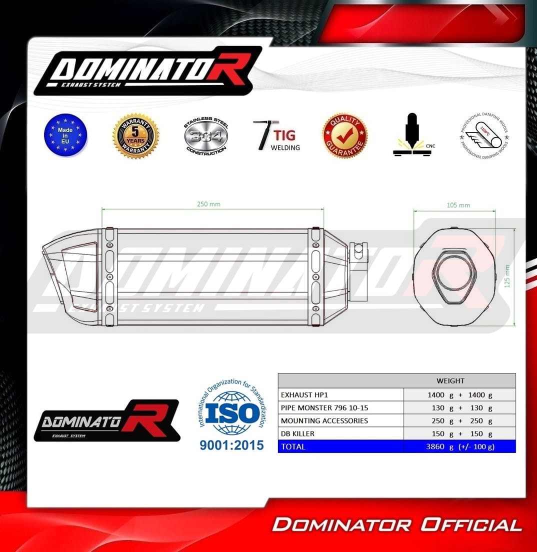 Lo scarico Dominator cambierà il carattere della tua moto dandole un suono unico. Il Sistema di Scarico continuo farà aumentare la potenza e la coppia del motore, riducendo così il peso del silenziatore.