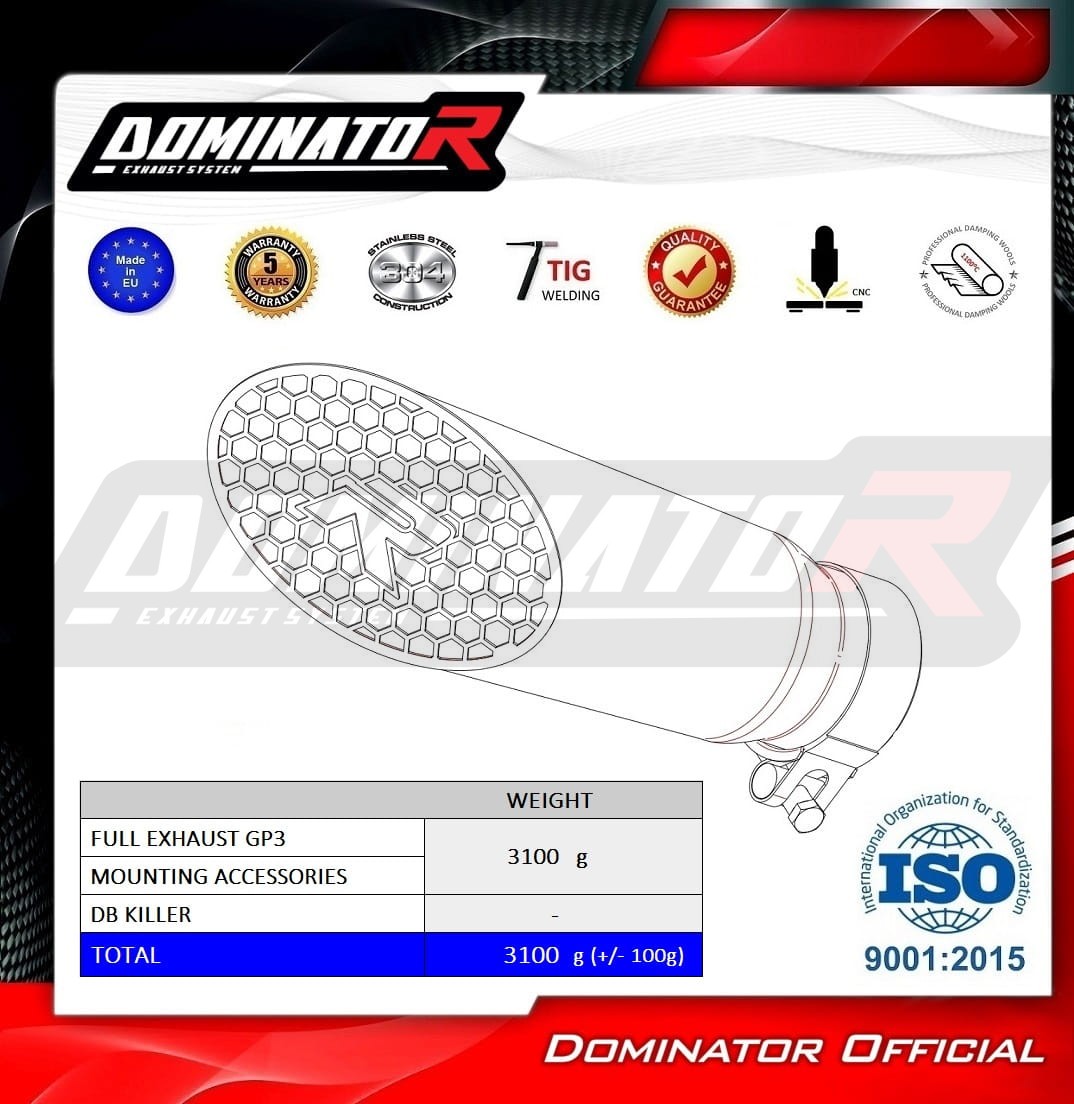 Il Sistema di scarico DOMINATOR con silenziatore GP3 e’ adatto ai modelli: