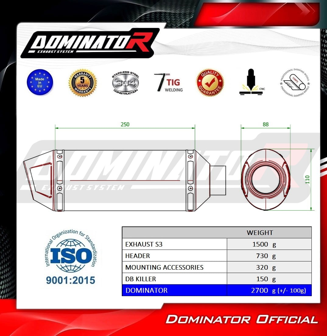 Il sistema di scarico Dominator cambierà il carattere della tua moto dandole un suono unico. Il kit farà aumentarela potenza e la coppia del motore, riducendo così il peso dell’intero Sistema di scarico.